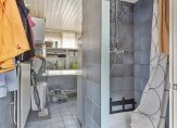 – geheel betegelde badkamer met een douche, wastafel en aansluiting voor een wasmachine;