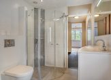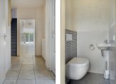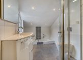– De ruime en geheel betegelde badkamer is luxe uitgevoerd en beschikt over een wastafelmeubel, hangend toilet, ligbad en een inloopdouche.