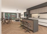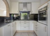 – Halfopen keuken. Aan de voorzijde bevindt zich de halfopen keuken, voorzien van een luxe keukeninrichting in U-opstelling. De keuken beschikt over een granieten werkblad en is uitgerust met hoogwaardige inbouwapparatuur van A-merken zoals een oven, koelkast, vaatwasser, inductiekookplaat en afzuigkap.
