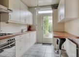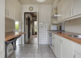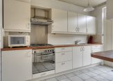 – De dichte keuken (oppervlakte: circa 8 m²) heeft een tegelvloer en een nette inrichting met gaskookplaat, oven, afzuigkap en veel kastruimte.