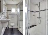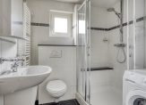 – De luxe badkamer is geheel betegeld en uitgerust met een douchecabine, hangend toilet, wastafel, designradiator en de aansluiting voor de wasmachine.