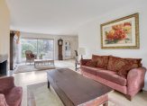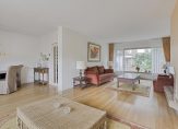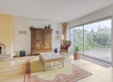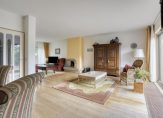 – Zeer ruime L-vormige woonkamer (oppervlakte: circa 48 m²) met een fraai eiken stoken parket, schouw met open haard gestukadoorde wanden en plafonds en een aluminium schuifpui naar het terras.