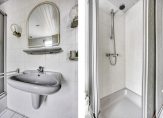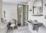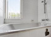 – Geheel betegelde badkamer met een ligbad met thermostaatkraan en douchegarnituur, een duoblok, een douchecabine met thermostaatkraan en een wastafel.