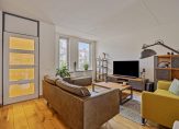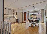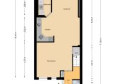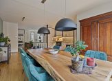 – royale,uitgebouwde, woonkamer (oppervlakte, inclusief open keuken maar liefst circa 46 m²), voorzien van een mooie eiken planken vloer, royale trapkast en toegang tot de achtertuin via een schuifpui; de woonkamer is aan de achterzijde voorzien van een zonneluifel;