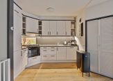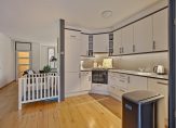 – open, centraal in de woning gesitueerde keuken, met een lichte keukeninrichting in hoekopstelling, voorzien van een kunststof aanrechtblad met RVS spoelbak, een 5-pits gaskookplaat, afzuigkap, combi-oven, vaatwasser en een koel-/vriescombinatie; alle apparatuur is van een A-merk;