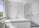 – Ruime en geheel betegelde badkamer (oppervlakte: circa 10 m²) met inloopdouche (met thermostaatkraan), ligbad, bidet, hangend toilet, dubbel wastafelmeubel en een vaste handdoekenkast.